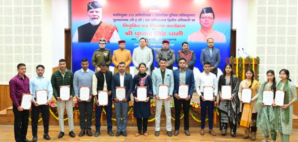 Dehradun: मुख्यमंत्री पुष्कर सिंह धामी ने बुधवार को मुख्य सेवक सदन में 215 उपनिरीक्षकों को नियुक्ति पत्र प्रदान किए। जिसमें 104 उप-निरीक्षक, 88 गुल्मनायक (पी.ए.सी) और 23 अग्निशमन द्वितीय अधिकारी शामिल हैं।